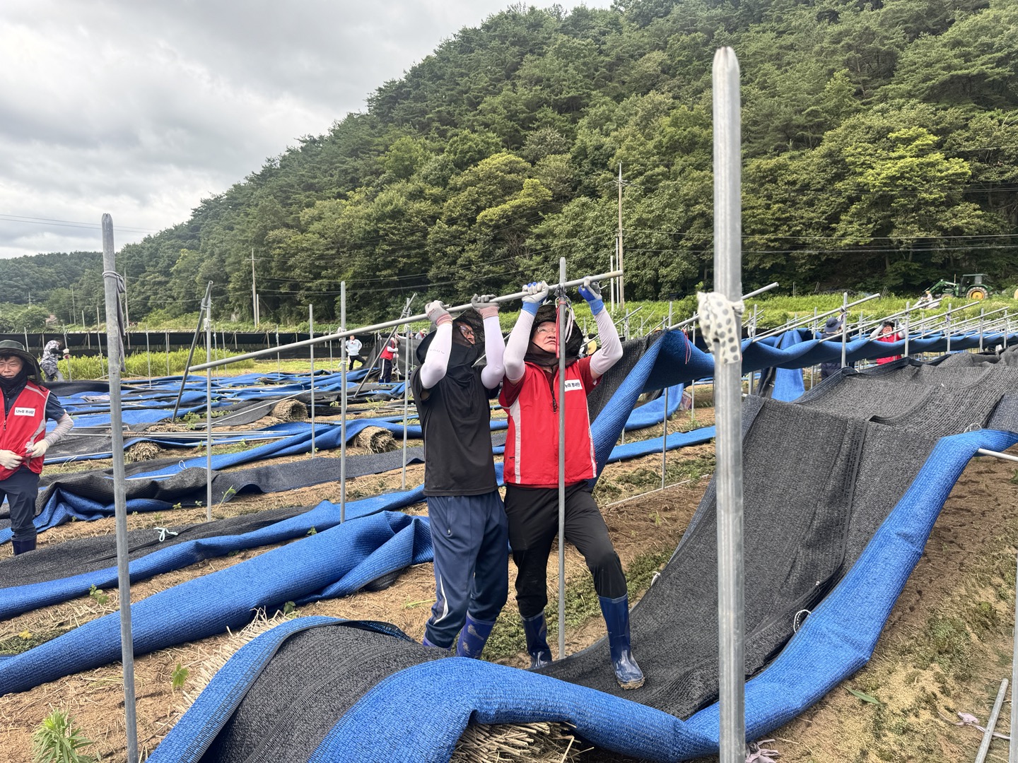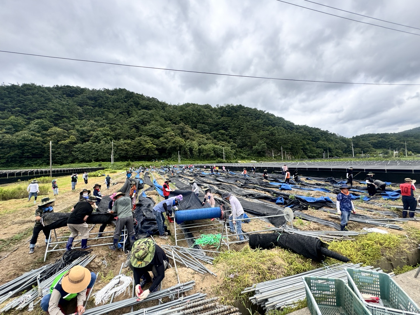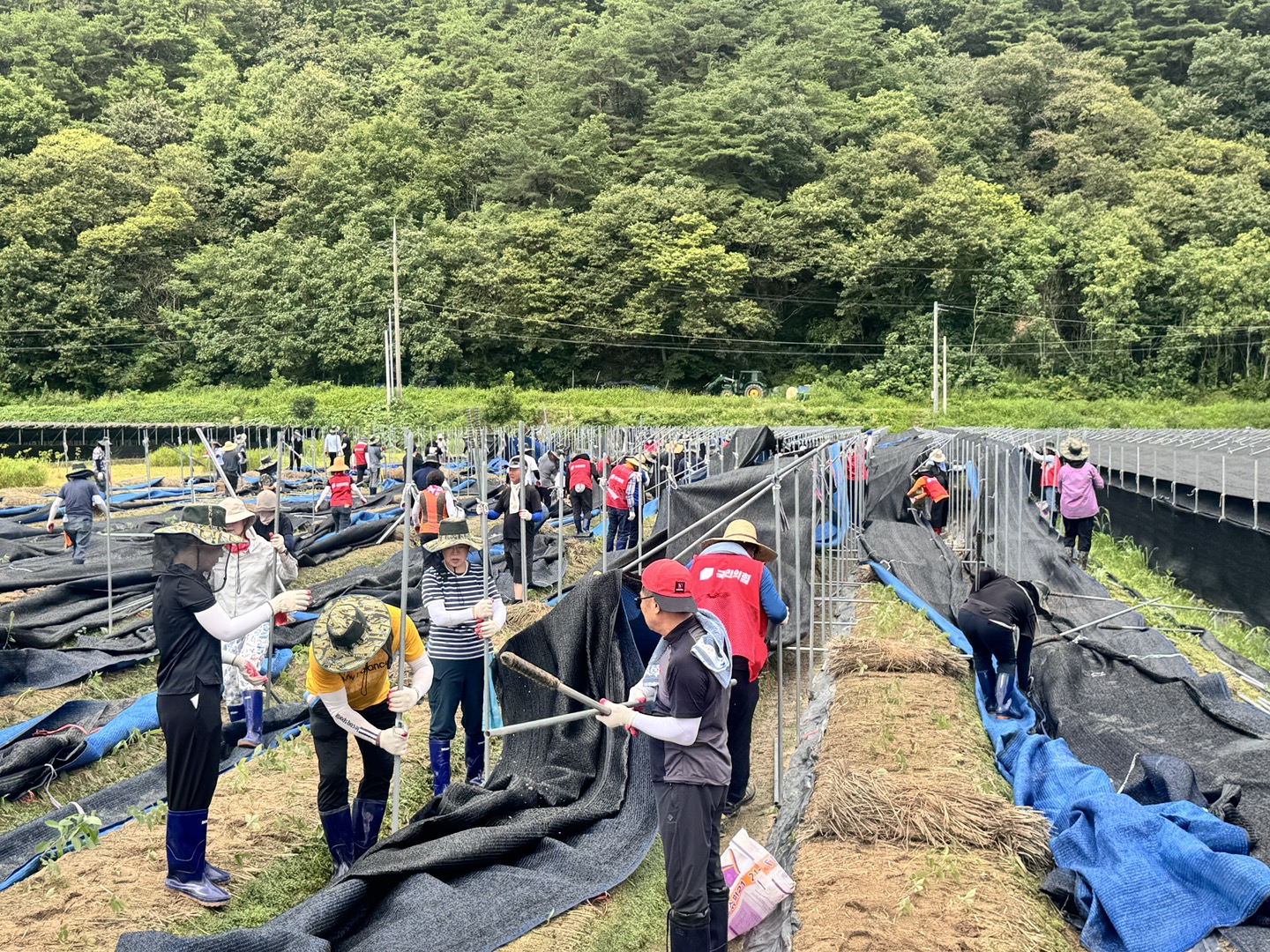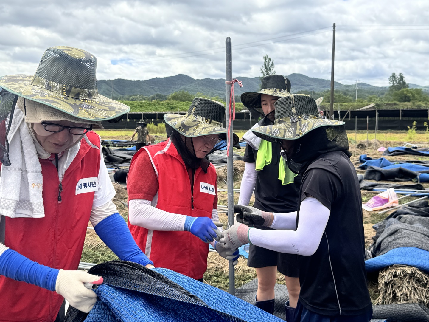 폭염의 날씨에도 불구하고 침수 된 인삼농가의 인삼포, 지주대 철거와 피해 작물 처리 등의 활동으로