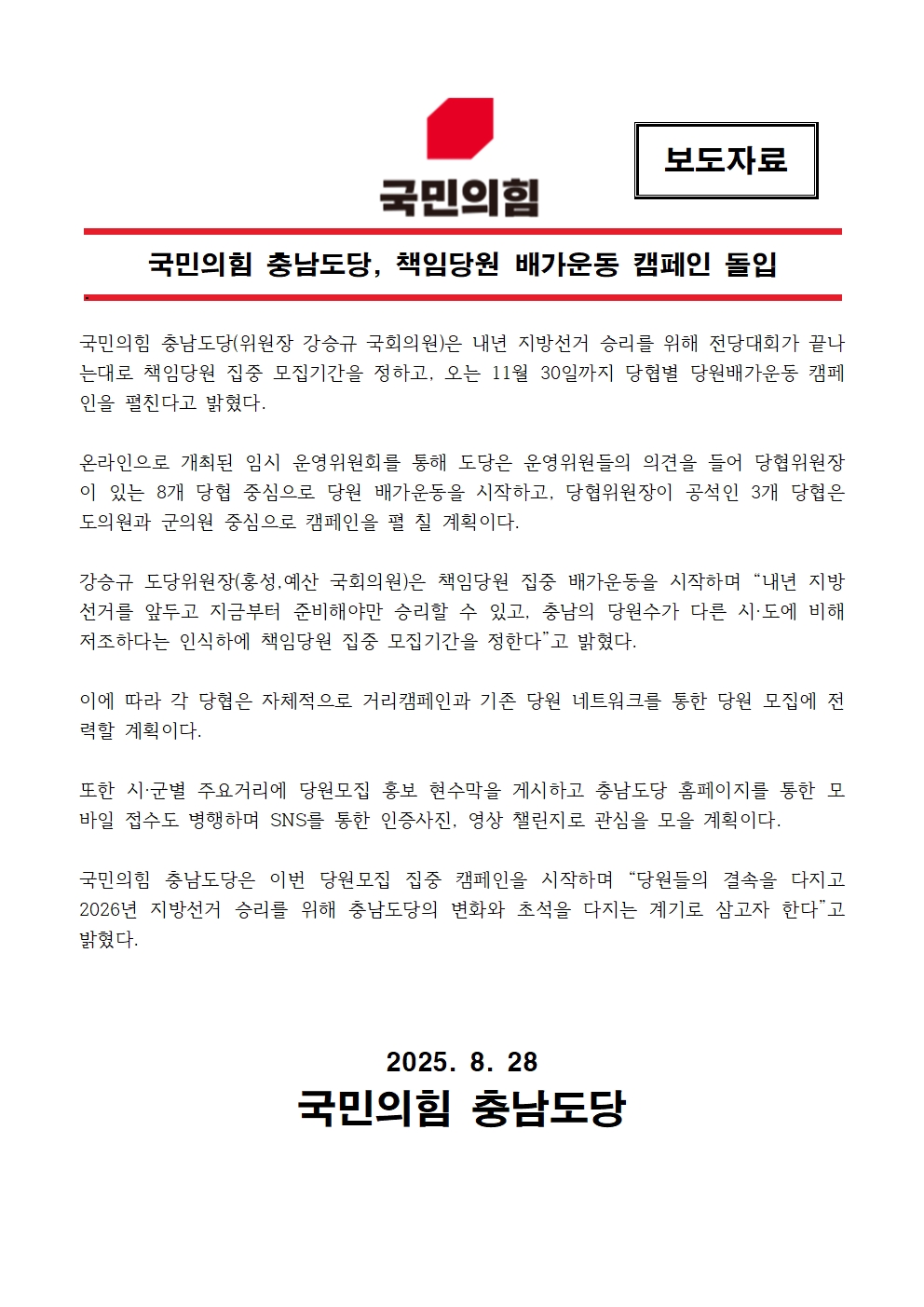 [보도] 국민의힘 충남도당, 책임당원 배가운동 캠페인 돌입